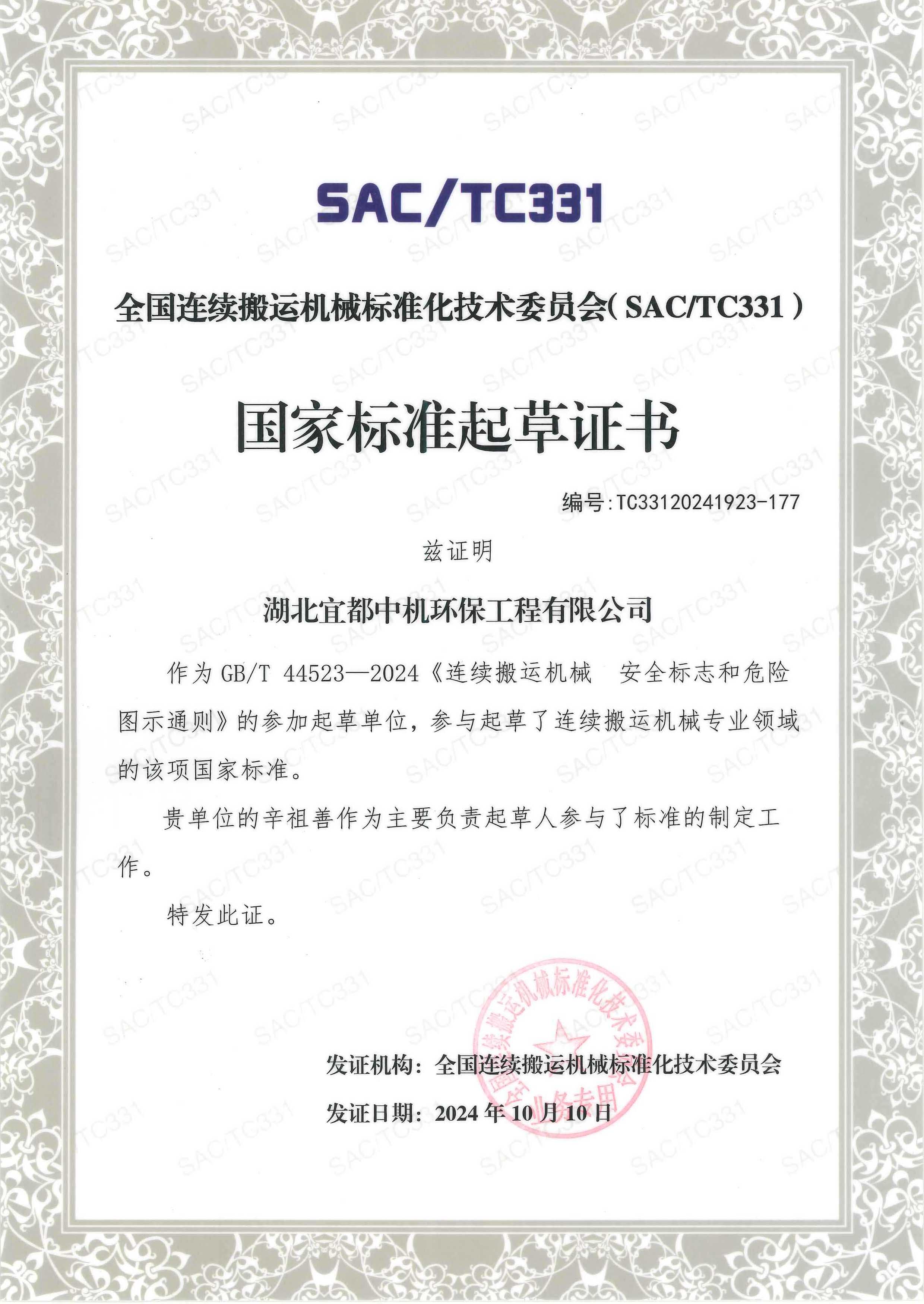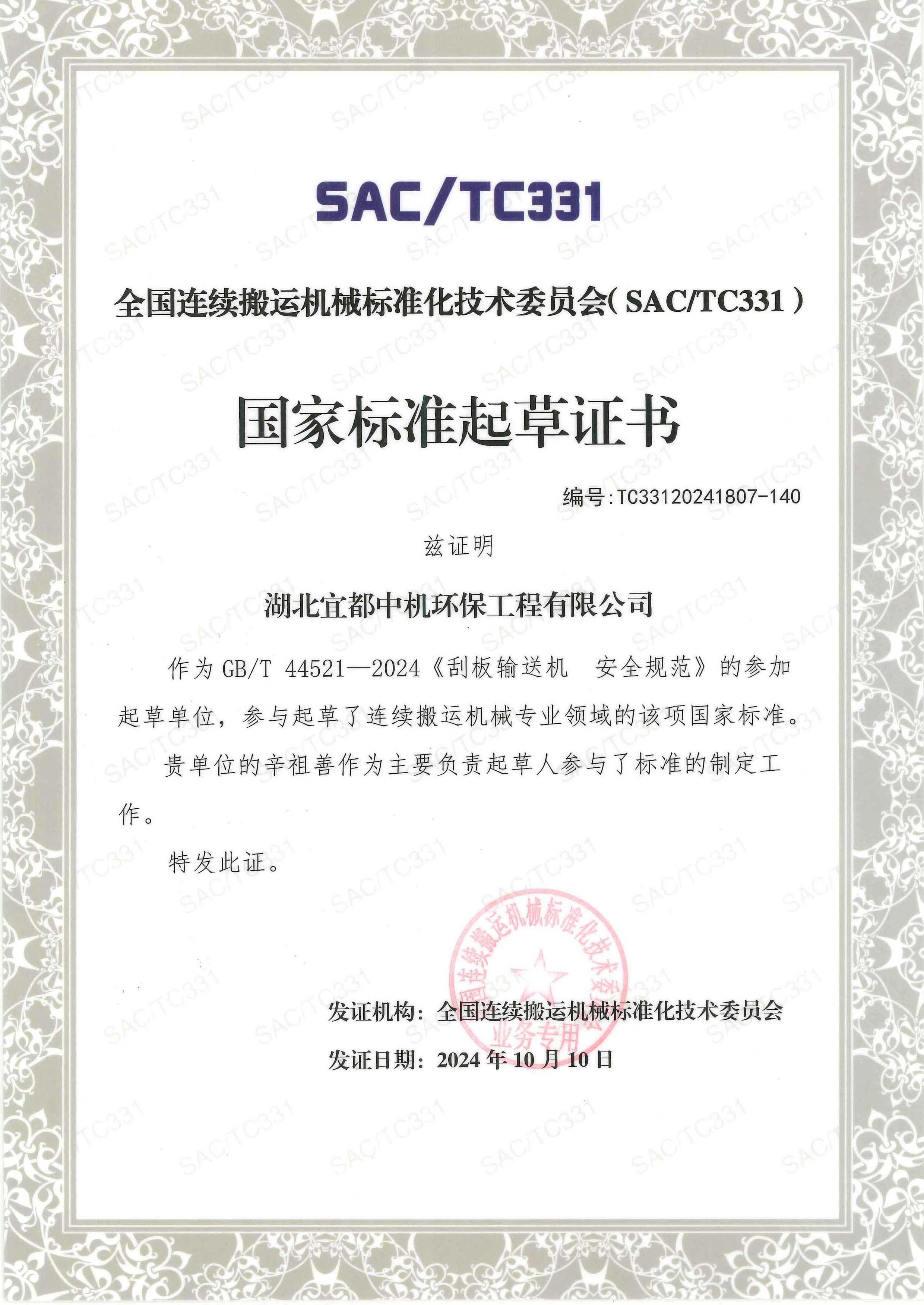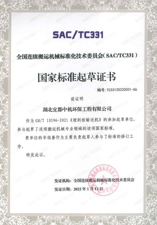 國(guó)家標(biāo)準(zhǔn)起草證書《埋刮板輸送機(jī)》
